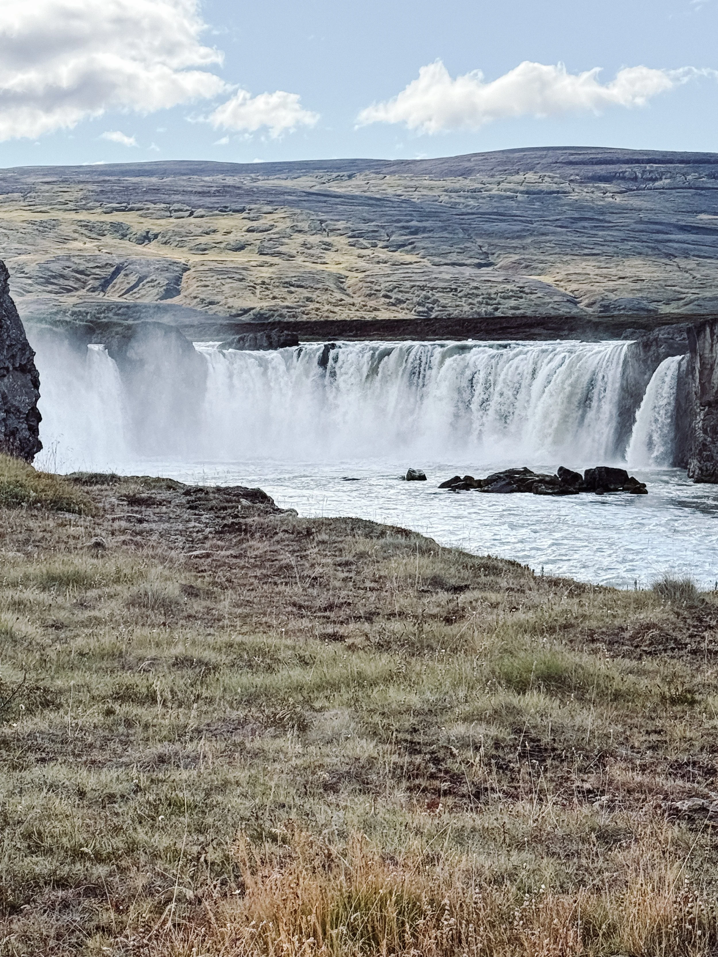 Pierwszy to oddalony o 50km i 40min jazdy wodospad Goðafoss. Nie ukrywam, że w tym momencie wodospadów miałam już trochę dosyć, ale Liam wciąż się nimi zachwycał, więc zobaczyliśmy i ten 😉 Jego nazwa w tłumaczeniu „Wodospad Bogów” wiąże się z legendą związaną z przyjęciem chrześcijaństwa przez Islandię. Według niej Thorgeir Ljosvetningagoði, islandzki prawniczy i wódz, wrzucił posągi nordyckich bogów do wodospadu, ogłaszając koniec pogaństwa.