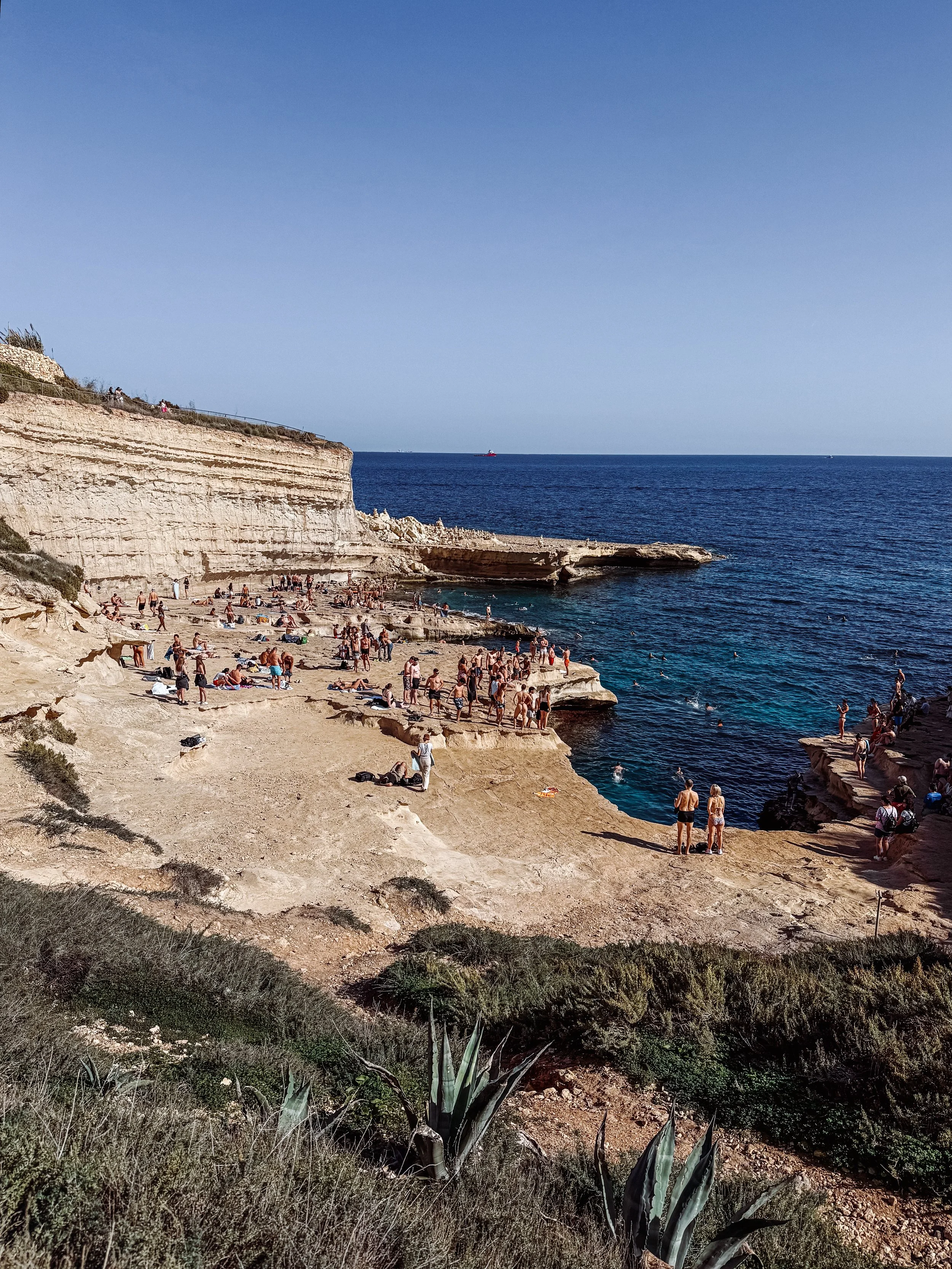 Jeśli z St. Peter’s Pool pójdziecie w stronę Marsaskali, niecałe 3km dalej traficie do Xrobb l-Għaġin, kolejnej pięknej kamienistej plaży, która wydaje mi się nieco mniej obłożona i bardziej popularna wśród lokalnych mieszkańców niż turystów. Można tam spędzić czas w bardzo podobny sposób, ale w mniejszym tłoku. To też miły spacer, który zajmuje niecałe 40min gwarantując ładne widoki. Jeśli wykąpaliście się już w poprzedniej zatoce, tu polecam usiąść z przekąską i pogapić się na morze - my często zabieramy ze sobą owoce i kawę w termosie i chodzimy tam w ciepłe, zimowe weekendy, kiedy jest prawie pusto, a słońce aż tak nie doskwiera.